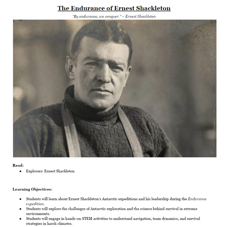 - Activities include building lifeboat models, simulating survival in extreme cold, and navigating Shackleton’s journey.