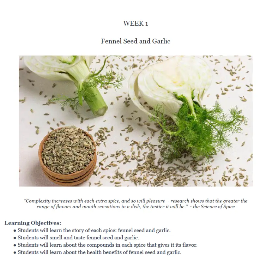 This immersive 8-week unit invites students to explore the world of spices through the lens of taste, chemistry, culture, and culinary arts. From warming phenols to pungent terpenes, students discover how spices impact our food—and our senses—through hands-on science and weekly kitchen experiences. Each week focuses on flavor profiles, molecular compounds, and global culinary traditions that bring spices to life.