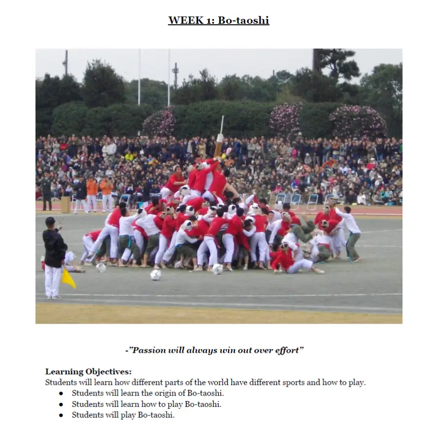 This exciting 8-week unit takes students on a global tour through the lens of sport. Each week introduces a unique game or athletic tradition from a different country or culture—some wildly competitive, others joyfully strange. Through hands-on activities, cultural exploration, and friendly challenges, students will not only move their bodies but also open their minds to how sport brings people together across the world.